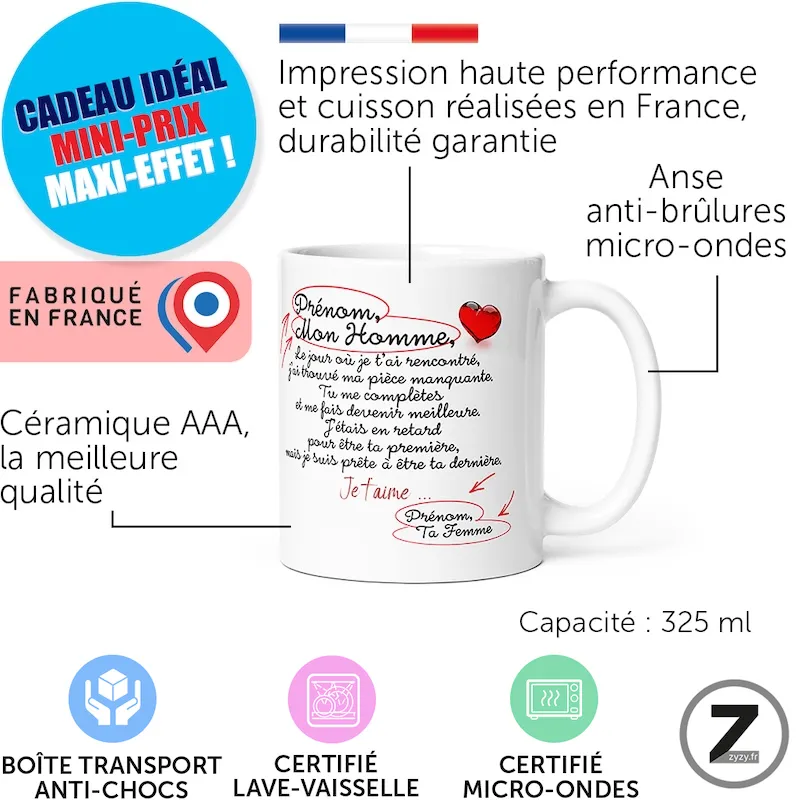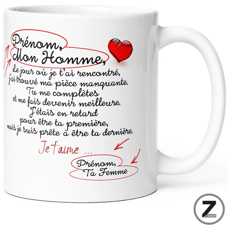 Mug amour personnalisable, Mug famille personnalisable, Mug personnalisable prénom, Mug Saint Valentin, Signature second prénom16,99 €Le mug personnalisable mon homme est un mug amour parfait pour offrir un cadeau romantique ou cadeau…Option à ajouter avant validation du panier16,99 €Le mug personnalisable mon homme est un mug amour parfait pour offrir un cadeau romantique ou cadeau humoristique. À la fois mug rigolo, tasse drôle et cadeau original humour, il s’adapte à toutes les occasions : cadeau d’anniversaire, mug Noël ou mug St Valentin.
