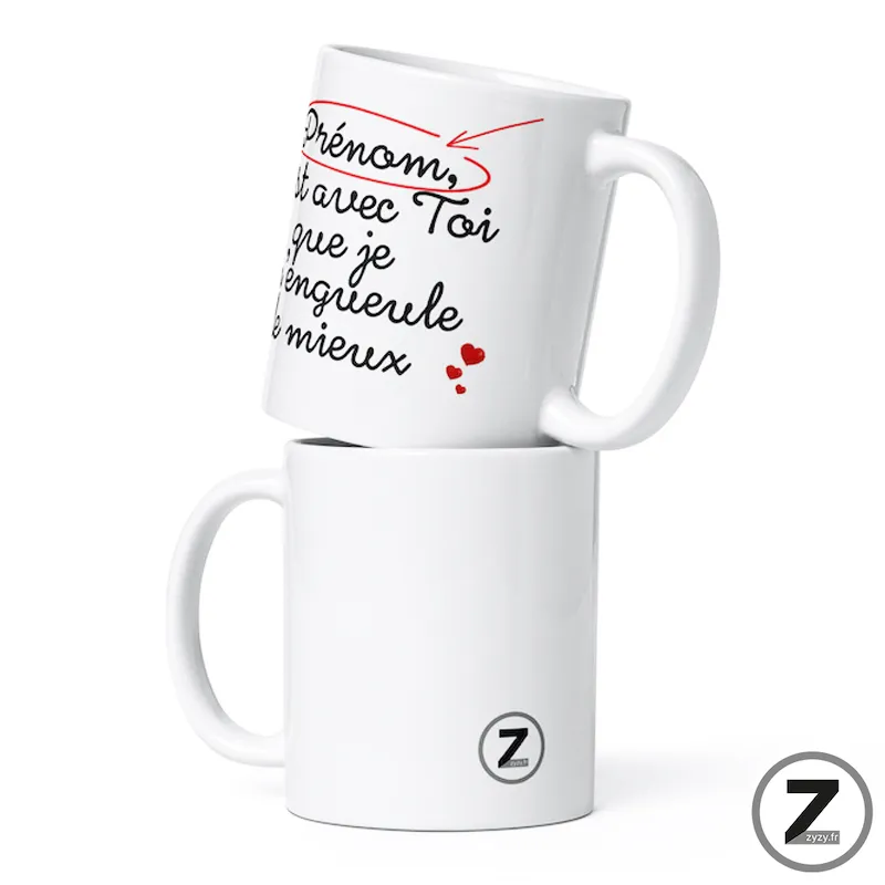 Mug amour personnalisable, Mug humour personnalisable, Mug personnalisable prénom, Mug Saint Valentin16,99 €Le mug personnalisable c’est avec toi que je m’engueule le mieux est un mug humour et mug…Option à ajouter avant validation du panier16,99 €Le mug personnalisable c’est avec toi que je m’engueule le mieux est un mug humour et mug amour idéal pour couples complices. À la fois mug rigolo, cadeau original humour et tasse drôle, il s’offre en cadeau St Valentin, cadeau d’anniversaire ou cadeau Noël.