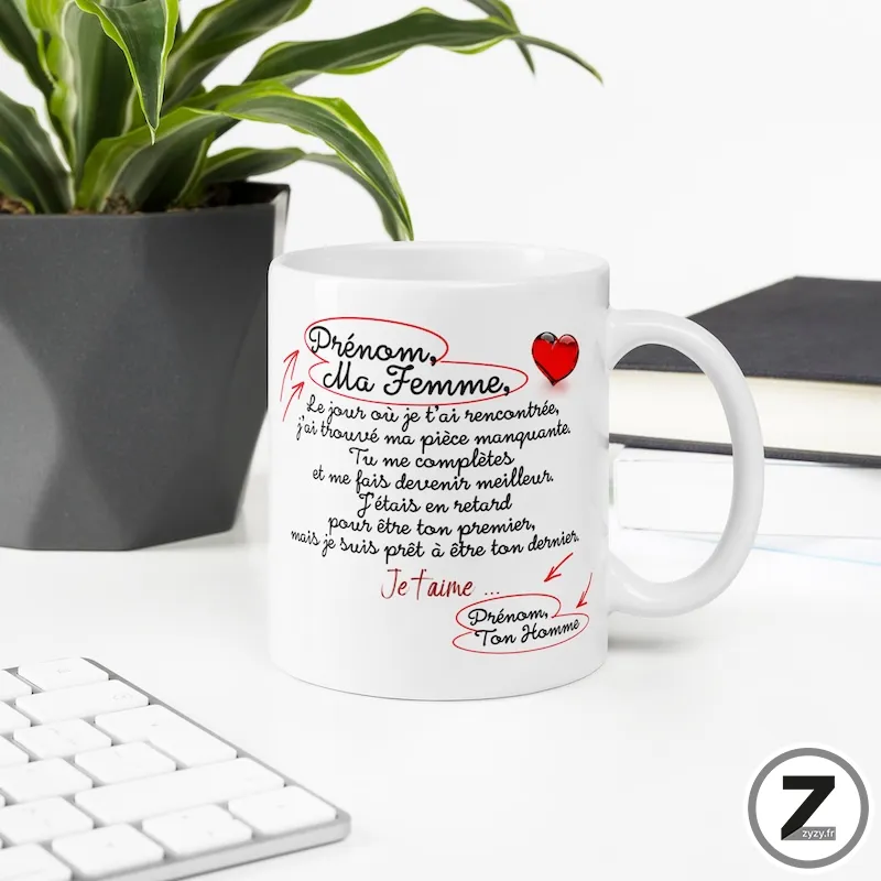 Mug amour personnalisable, Mug famille personnalisable, Mug personnalisable prénom, Mug Saint Valentin, Signature second prénom16,99 €Le mug personnalisable ma femme allie mug humour, mug amour et cadeau romantique. Une tasse drôle et…Option à ajouter avant validation du panier16,99 €Le mug personnalisable ma femme allie mug humour, mug amour et cadeau romantique. Une tasse drôle et mug rigolo, idéale comme cadeau humoristique, mug Noël ou mug St Valentin. Grâce à la personnalisation prénom, ce cadeau d’anniversaire devient unique et plein de charme. Une déclaration d’amour subtile, utile et durable.