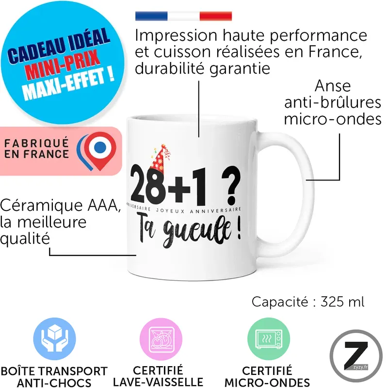 16,99 €Ce mug anniversaire humoristique assume un message cash, une qualité française fiable et un usage quotidien provocant…Ajouter au panier16,99 €Ce mug anniversaire humoristique assume un message cash, une qualité française fiable et un usage quotidien provocant mais maîtrisé.