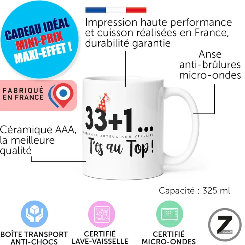 Mug anniversaire 33+1 t’es au top !