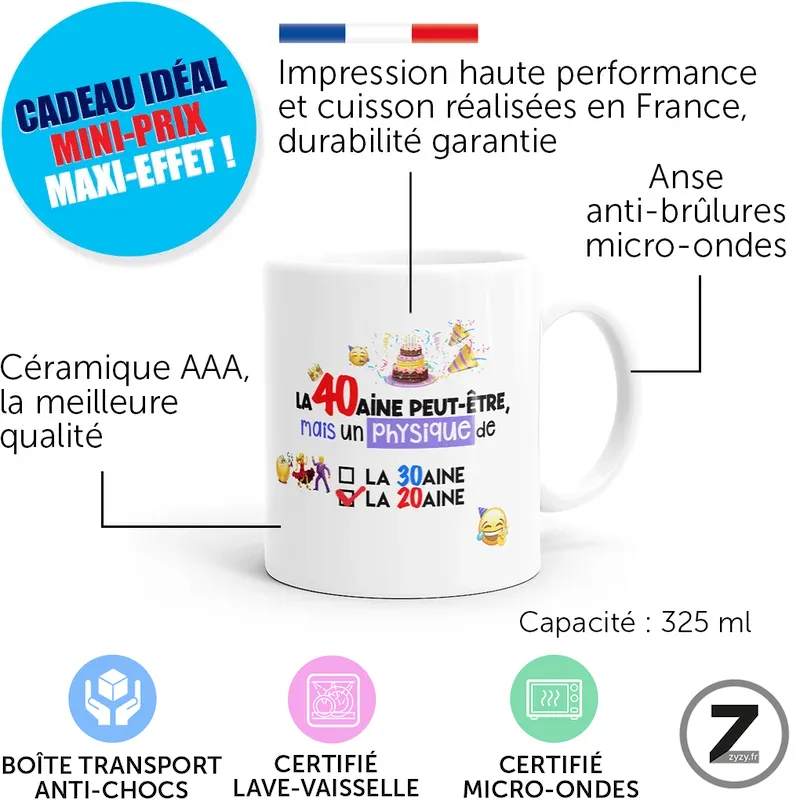 Ainsi, offrir ce mug 40 ans crée une surprise utile, drôle et mémorable, idéale pour amis, collègues ou proches aimant l’autodérision.