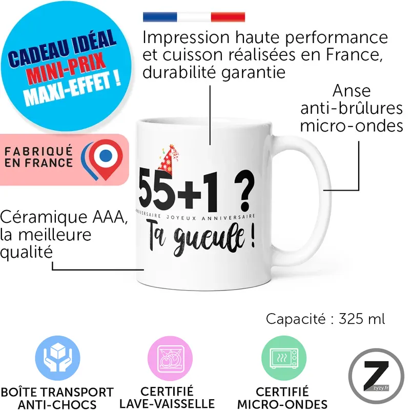 16,99 €Ce mug anniversaire humoristique célèbre cinquante-six ans avec autodérision, qualité française et sourire quotidien partagé autour d’une…Ajouter au panier16,99 €Ce mug anniversaire humoristique célèbre cinquante-six ans avec autodérision, qualité française et sourire quotidien partagé autour d’une boisson chaude.