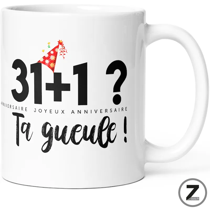 16,99 €Ainsi ce mug anniversaire transforme les 31+1 ans en blague assumée et fait sourire dès le premier…Ajouter au panier16,99 €Ainsi ce mug anniversaire transforme les 31+1 ans en blague assumée et fait sourire dès le premier café.