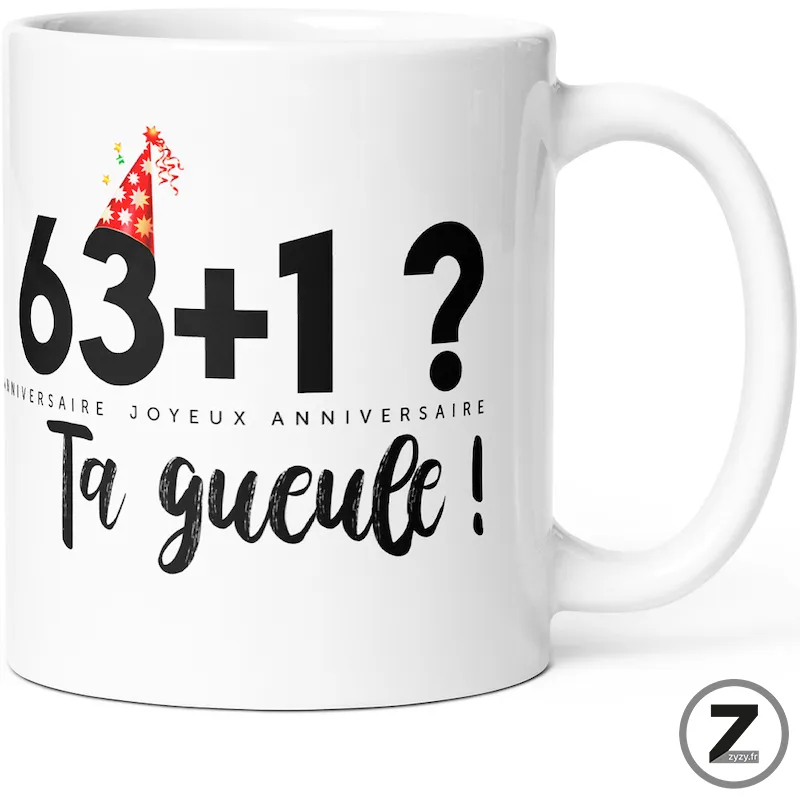 16,99 €Le mug humour anniversaire de merde 63 ans est le mug rigolo idéal pour célébrer la soixantaine…Ajouter au panier16,99 €Le mug humour anniversaire de merde 63 ans est le mug rigolo idéal pour célébrer la soixantaine avec humour. Un cadeau humoristique, mug Noël ou cadeau collègue parfait, à offrir sans modération. Ce cadeau original humour et tasse drôle prouve qu’à 63 ans, on a encore le droit de rire !