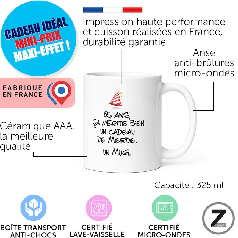 16,99 €Le mug humour anniversaire de merde 65 ans est le cadeau humoristique parfait pour fêter la soixantaine…Ajouter au panier16,99 €Le mug humour anniversaire de merde 65 ans est le cadeau humoristique parfait pour fêter la soixantaine avec panache. Un mug rigolo, cadeau original humour et tasse drôle à offrir comme cadeau d’anniversaire, mug Noël ou cadeau collègue. À 65 ans, riez du temps qui passe !