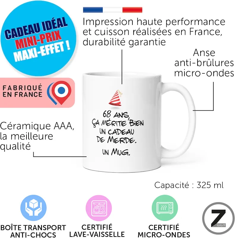 16,99 €Découvrez le mug humour anniversaire de merde 68 ans, le cadeau original humour qui garantit l'hilarité !…Ajouter au panier16,99 €Découvrez le mug humour anniversaire de merde 68 ans, le cadeau original humour qui garantit l’hilarité ! Parce qu’atteindre 68 ans mérite de l’autodérision, ce mug rigolo est la solution pour un cadeau d’anniversaire mémorable. Idéal aussi comme mug collègue ou mug Noël, il est fabriqué en céramique durable, compatible micro-ondes et lave-vaisselle. Ne cherchez plus le parfait cadeau humoristique pour une tasse drôle qui ne passe pas inaperçue. C’est l’anti-cadeau de merde par excellence, parfait pour un cadeau soixantaine ou un cadeau soixante-huit ans. Commandez ce mug humour 68 ans de haute qualité et offrez un rire durable.