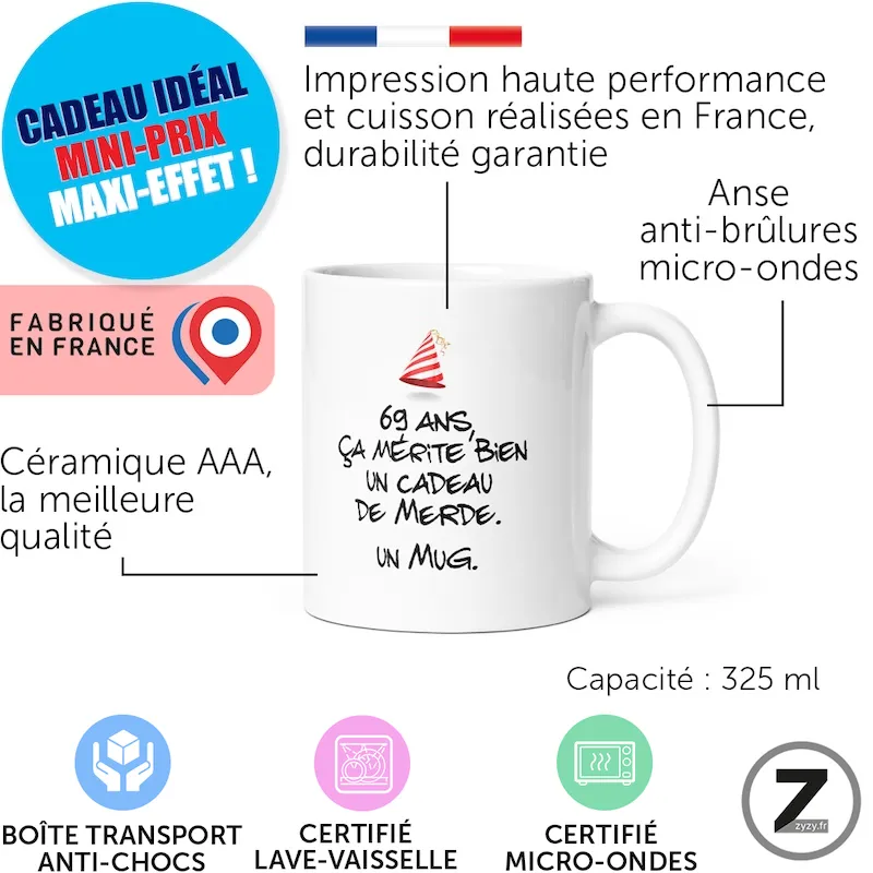 16,99 €Le mug humour anniversaire de merde 69 ans est le cadeau humoristique idéal pour célébrer la soixantaine…Ajouter au panier16,99 €Le mug humour anniversaire de merde 69 ans est le cadeau humoristique idéal pour célébrer la soixantaine avec autodérision. Un mug rigolo, cadeau original humour et tasse drôle parfait comme cadeau d’anniversaire, mug Noël ou cadeau collègue. À 69 ans, on rit de tout !