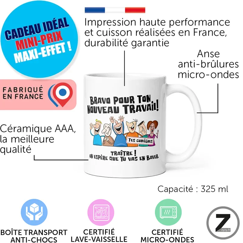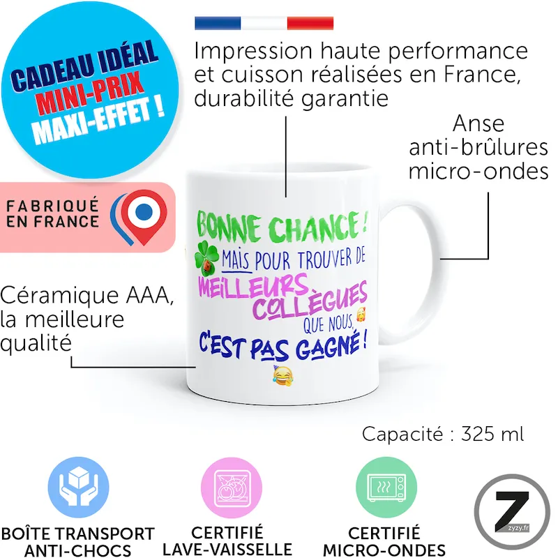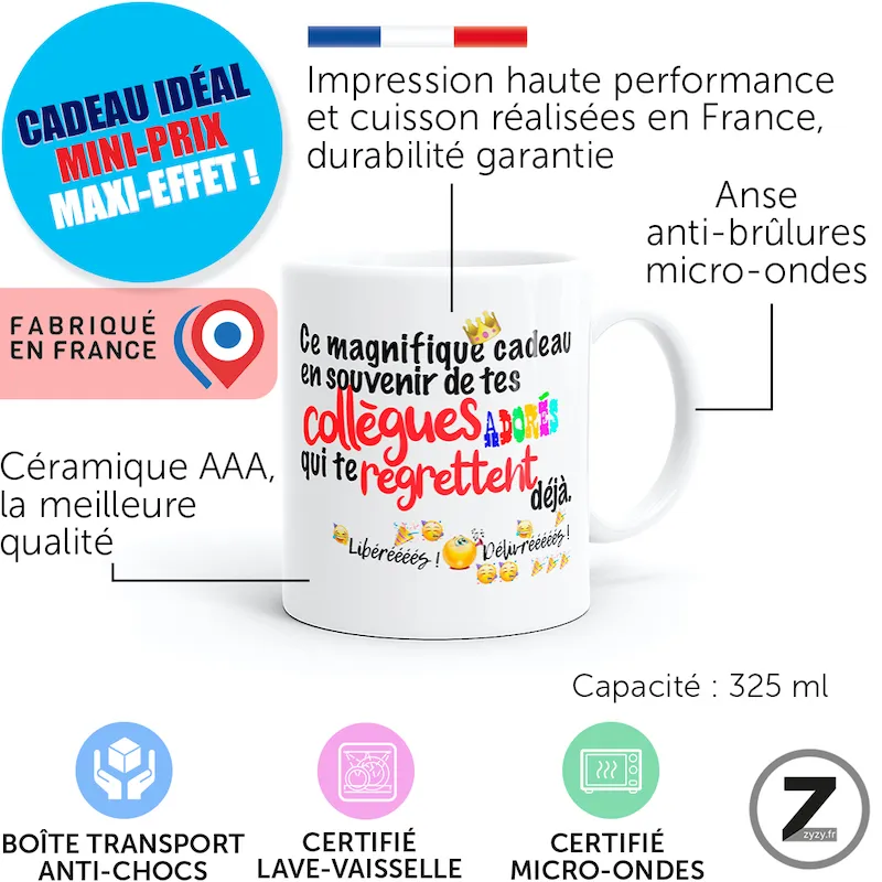 Ainsi c’est un cadeau collègue parfait, pour cadeau pot de départ, cadeau mutation, ou mug anniversaire.