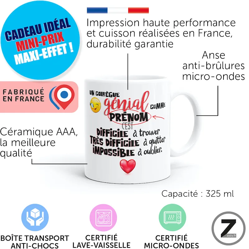 16,99 €Le mug personnalisable collègue au top allie tasse drôle, mug rigolo et personnalisation prénom. Ainsi, il devient…Option à ajouter avant validation du panier16,99 €Le mug personnalisable collègue au top allie tasse drôle, mug rigolo et personnalisation prénom. Ainsi, il devient cadeau humoristique idéal : cadeau d’anniversaire, cadeau Noël, cadeau collègue, cadeau mutation, cadeau pot de départ, cadeau retraite, mug Noël, mug mutation, mug retraite, mug amour, mug anniversaire.