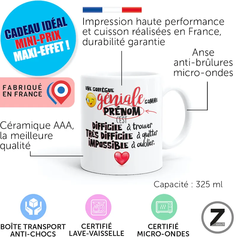 16,99 €Mug personnalisable collègue géniale. Cadeau humour parfait pour collègue inspirante. Idéal anniversaire, Noël, pot de départ, mutation…Option à ajouter avant validation du panier16,99 €Mug personnalisable collègue géniale. Cadeau humour parfait pour collègue inspirante. Idéal anniversaire, Noël, pot de départ, mutation ou retraite.