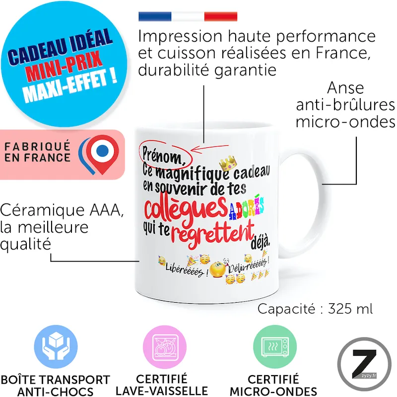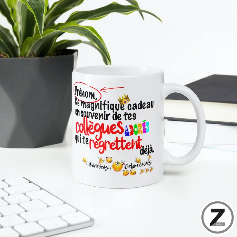 16,99 €Le mug personnalisable collègues libérés est un mug humour et mug rigolo parfait pour un cadeau collègue,…Option à ajouter avant validation du panier16,99 €Le mug personnalisable collègues libérés est un mug humour et mug rigolo parfait pour un cadeau collègue, une mutation ou une retraite. Avec sa tasse drôle personnalisable, il devient un cadeau original humour idéal pour répandre la bonne humeur au bureau.