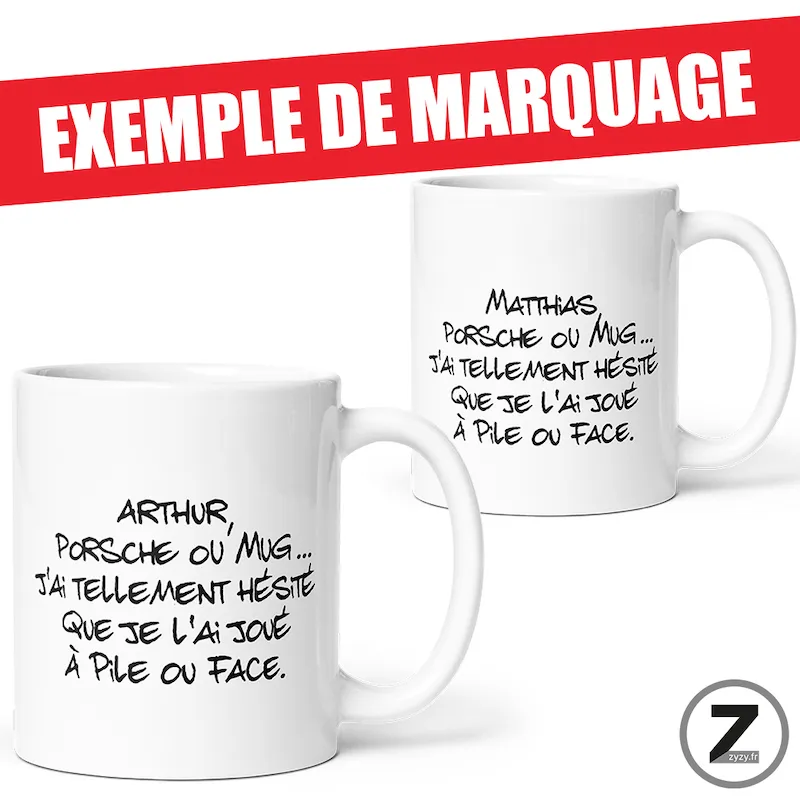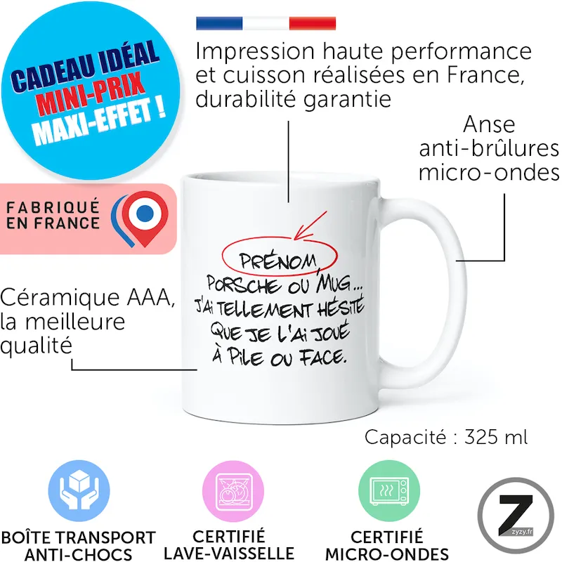 16,99 €cLe mug personnalisable Porsche réunit humour raffiné, design voiture de prestige, qualité premium et personnalisation prénom. Ainsi,…Option à ajouter avant validation du panier16,99 €cLe mug personnalisable Porsche réunit humour raffiné, design voiture de prestige, qualité premium et personnalisation prénom. Ainsi, ce mug humour devient un cadeau humoristique parfait, idéal comme cadeau d’anniversaire, cadeau Noël, mug collègue, cadeau ami, cadeau amie ou cadeau St Valentin. Ensuite, sa céramique durable, son impression française et son emballage antichoc garantissent une expérience haut-de-gamme. Finalement, ce mug rigolo propose un style sportif chic à chaque pause café, avec une vraie touche luxe.