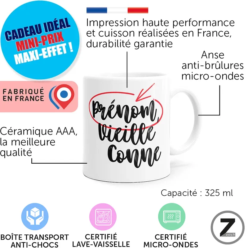 16,99 €Ce mug personnalisable Vieille conne apporte un humour assumé transformant chaque pause café en moment complice et…Option à ajouter avant validation du panier16,99 €Ce mug personnalisable Vieille conne apporte un humour assumé transformant chaque pause café en moment complice et décomplexé.