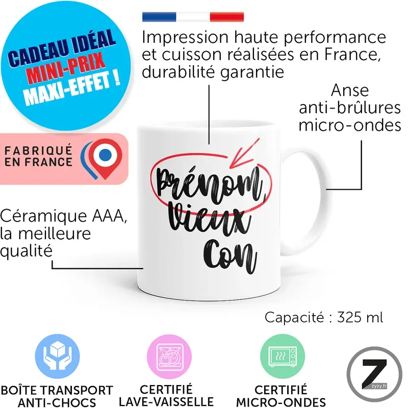 Sur ziggymug.fr, choisissez un mug personnalisé avec personnalisation prénom, pour une tasse drôle durable et élégante.Vue rapide -