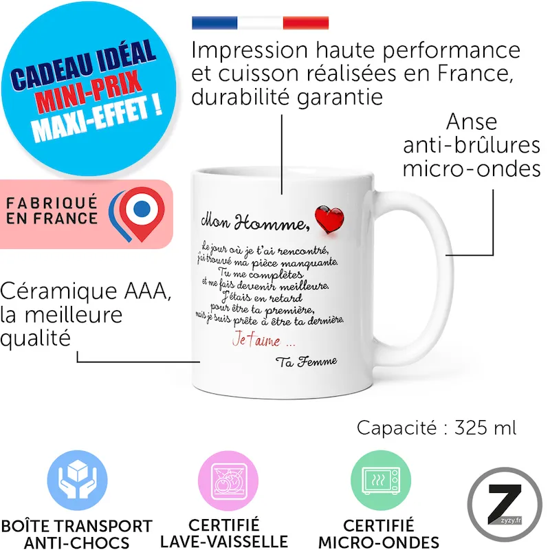 Enfin sa qualité française durable assure usage quotidien et rires assurés, avec une tasse drôle livrée protégée.Vue rapide