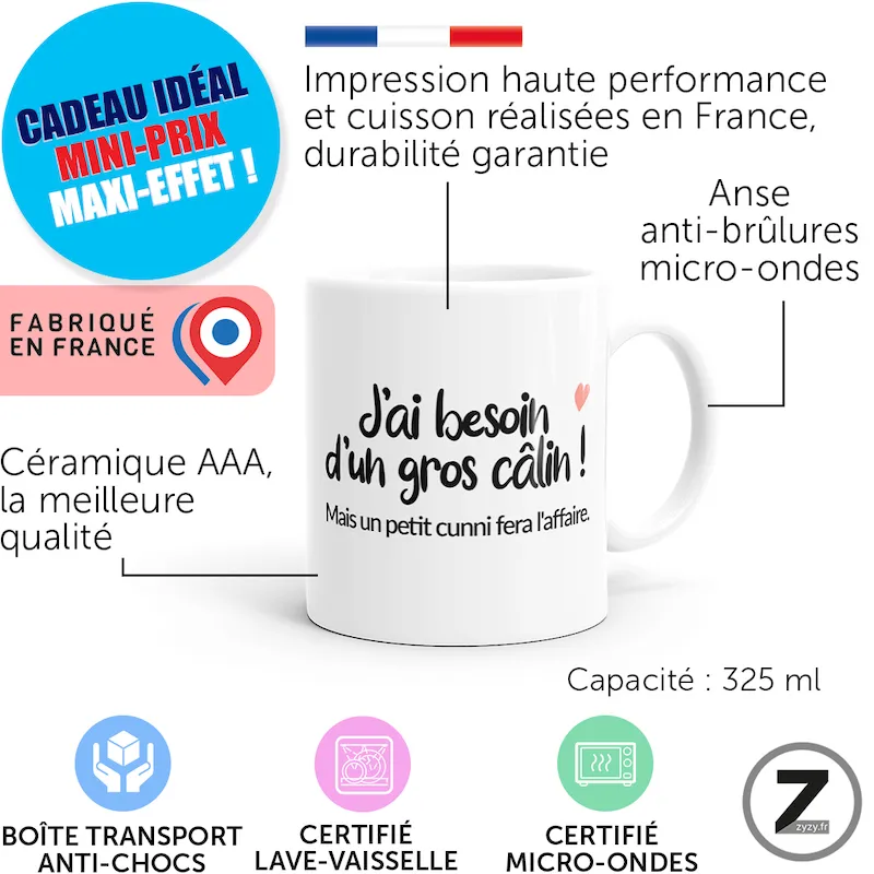 Mug pas cher, IMPRESSION FRANÇAISE ! GARANTIE TOTALE ZYZY.FR, tenue des couleurs et anse anti-brûlures : une céramique de la plus haute qualité (AAA), contenance 325ml, compatible micro-ondes et lave-vaisselle, l’anse ne brûle pas, l’image ne se dégrade pas avec le temps