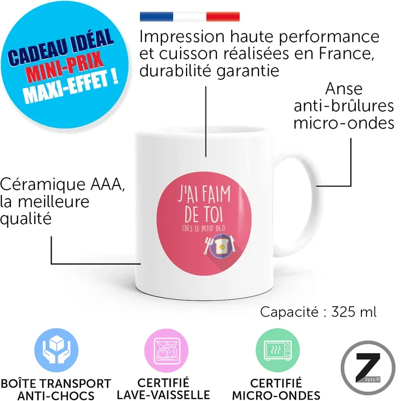 En outre, la qualité de la céramique assure une résistance durable. Ainsi, l’impression reste nette au fil du temps, tandis que l’anse confortable rend son usage agréable. Ensuite, la compatibilité micro-ondes et lave-vaisselle simplifie le quotidien, ce qui en fait un mug sexy à la fois drôle et pratique.