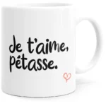 Le Mug JE T’AIME PÉTASSE assume un mug amour audacieux, mêlant message romantique et provocation affectueuse assumée.