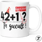 Découvrez le Mug personnalisable 42+1 TA GUEULE !, un mug anniversaire unique pour célébrer un mug 43 ansavec humour subtil et gaieté.