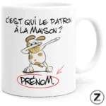 Dès le premier café, imposez l’ambiance avec le Mug personnalisable C’EST QUI LE PATRON CHIEN plein d’autorité joyeuse.